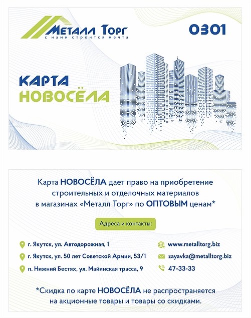 - Став участником программы «Новосел», вы получаете карту НОВОСЕЛА уже с ОПТОВОЙ скидкой.